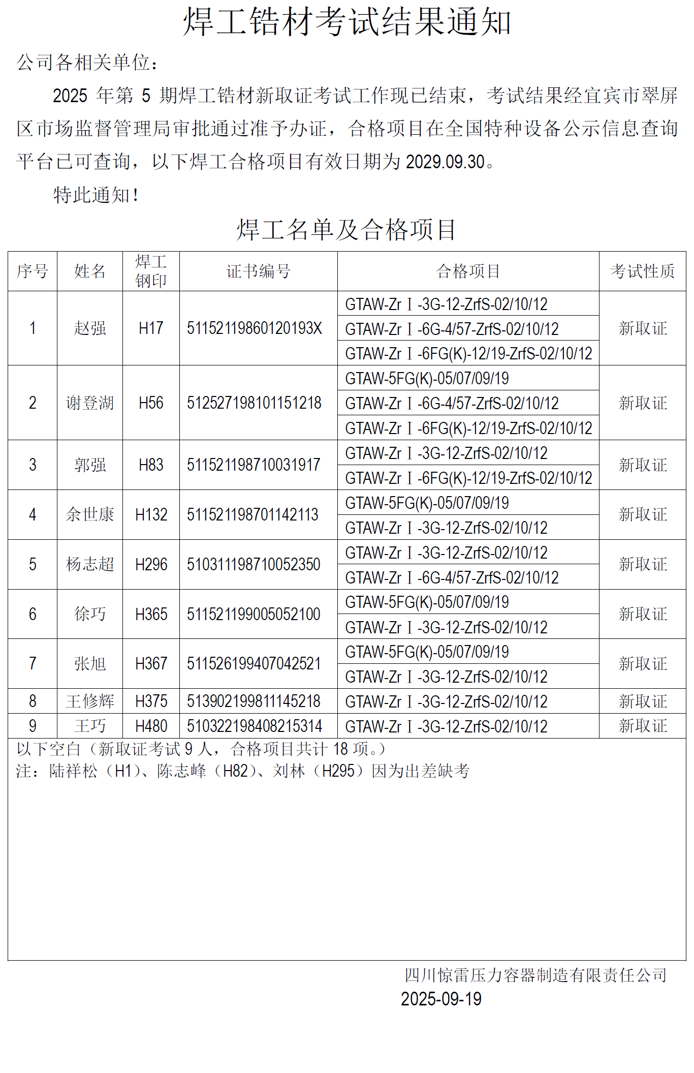 四川惊雷科技股份有限公司焊工锆材考试结果通知 (2025年第5期新取证)